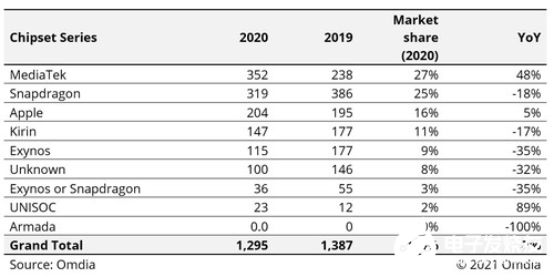 根据Omdia的报告,2020年联发科智能手机芯片出货量达3.518 亿块,同比增长47.8%。较之2019年17.2%的市场份额,2020年联发科市场占有率已升至27.2%。
