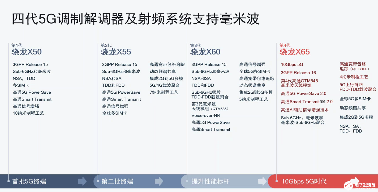 据悉,高通四代5G调制解调器及射频系统都支持毫米波连接。从骁龙X50、骁龙X55、骁龙X60到骁龙X65,5G解决方案一直在持续演进。今年2月推出的骁龙X65是全球首个支持10Gbps 5G和首个符合3GPP Release 16规范的5G调制解调器及射频系统。