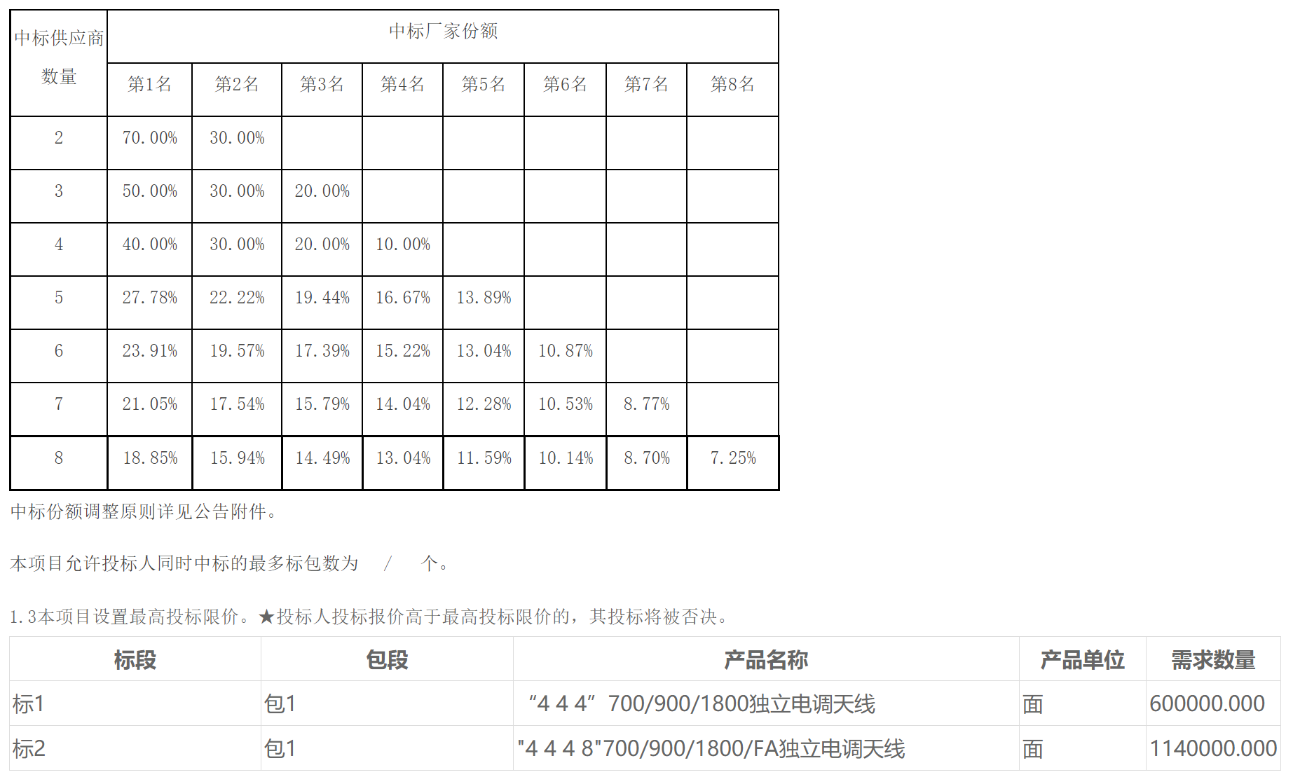 天线方面,此次采购的为多频段(含700M)天线产品,共有三类6款:4+4+4天线(700/900/1800MHz),分为普通增益和高增益两款;4+4+4+8天线(700/900/1800/FA),分为长款和短款;单4天线(700M),分为普通增益和高增益两款。该项目天线采购规模约174万面,其中4+4+4+8天线需求114万面。