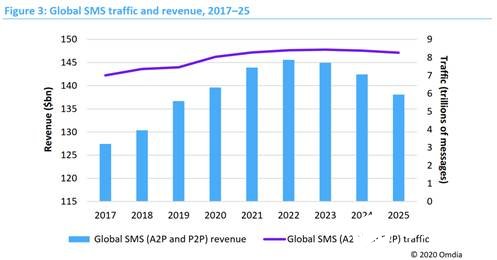 蓝色柱状图代表SMS营收,紫色曲线代表SMS产生的量