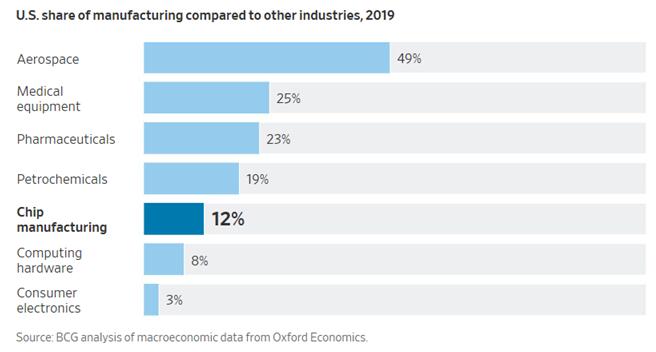 随着日本、韩国、中国大陆和中国台湾的崛起,美国的制造业在近几十年来逐渐离开本土。部分原因在于,亚洲的国家政府会为芯片厂商提供补贴激励政策,以鼓励建造工厂,发展本土产业。与此同时,美国以外的半导体供应链不断壮大,以及能够操作高昂制造设备的熟练工程师队伍不断扩大。