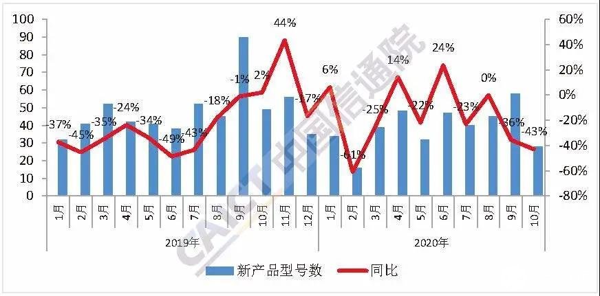 2020年10月,国内手机上市新机型28款,同比下降42.9%。1-10月,上市新机型累计387款,同比下降19.7%。