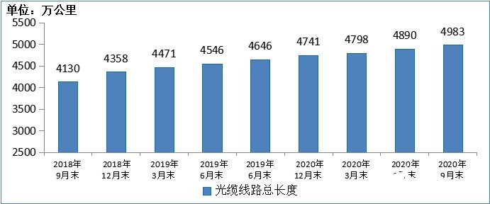 光缆线路总长度稳步增长。截至2020年9月末,全国光缆线路总长度达到4983万公里,同比增长7.3%,比上年末净增242万公里。其中接入网光缆、本地网中继光缆和长途光缆线路所占比重分别为62.1%、35.7%和2.2%。