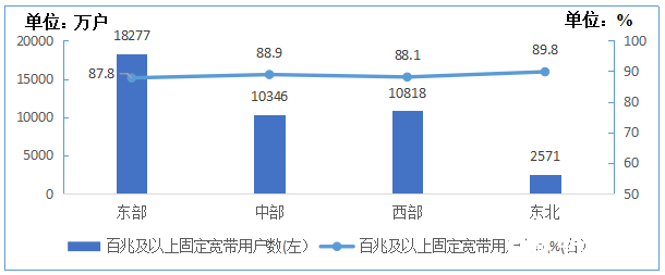 在地区分布上,百兆及以上固定宽带接入用户渗透率领先。截至9月末,东、中、西和东北地区100Mbps及以上固定宽带接入用户分别达到18277万、10346万、10818万和2571万户,占本地区固定互联网宽带接入用户总数的比重分别为87.8%、88.9%、88.1%和89.8%,东北地区占比领先全国。各省百兆以上固定宽带接入用户最高占比与最低占比之差为17.2个百分点。