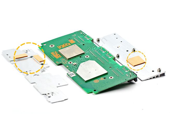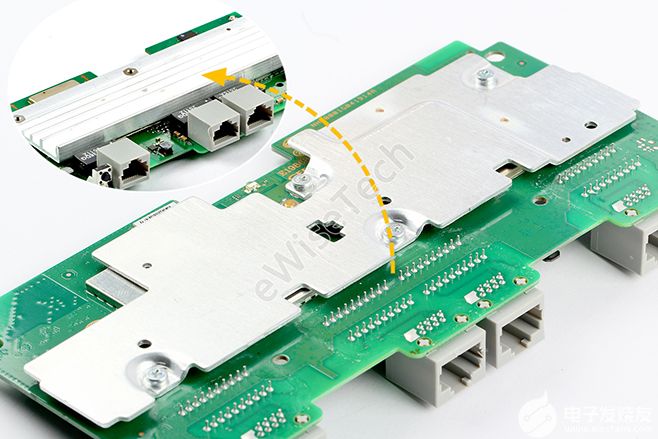 由于WiFi需要较好的散热,所以主板正反面都配有一块铝制散热块,两块散热块通过四颗十字螺丝贯穿主板固定,将主板夹在中间,给路由器增加配重,同时保证主板的散热性能。