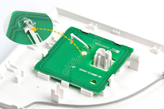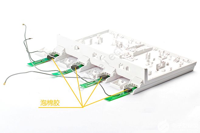 顶壳右下角贴有NFC感应贴纸的地方,支持手机一碰连接WIFI功能的NFC。在内部则是使用一块正方形PCB天线板,天线板与主板之间采用通过焊锡固定同轴线连接。