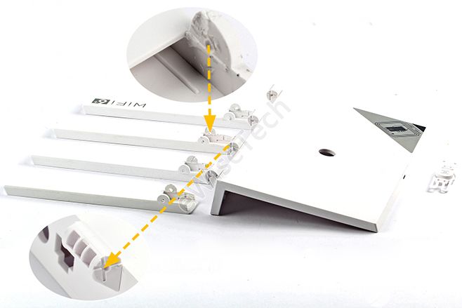AX3 Pro使用4根PCB材质的WiFi天线,2.4G /5.8G间隔排列组装,每一根天线板中部和顶部各有两块泡棉胶用来增强固定和支撑PCB板。