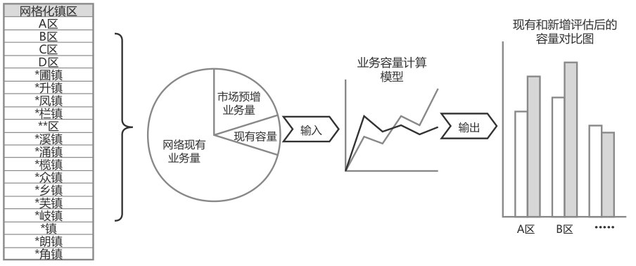 资源投放与市场发展的系统,可以结合镇区网格化、市场规划发展数据或是预增用户量数据和镇区现网设备的承载数据,通过各类业务量预测模型的计算,对新增容量需求做出准确的评估预测,最终输出现有和新增评估后的容量对比图,各个镇区所需的扩容需求将一目了然,轻松实现资源的合理规划和科学投放,自动化实现方案如下图4所示: