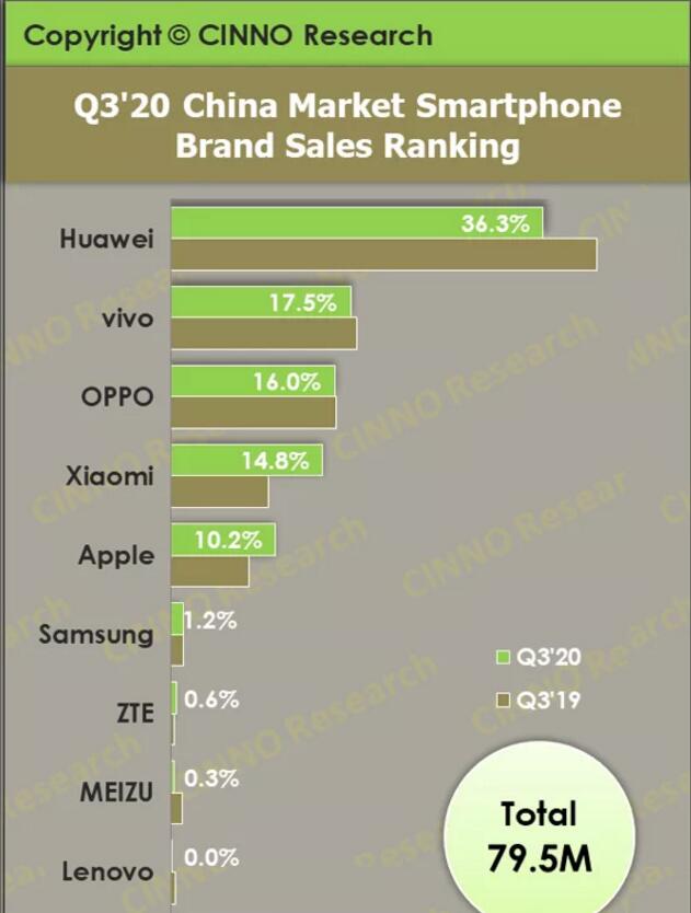 根据CINNO Research发布的最新报告,今年第三季度(即2020年第三季度),中国市场智能手机的出货量有所下降。这很可能是由于新冠疫情大流行所致。
