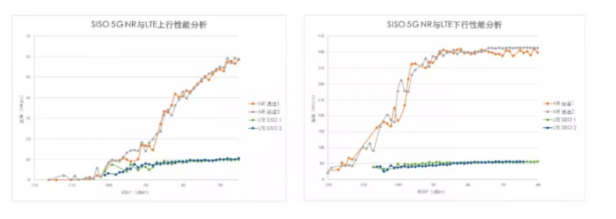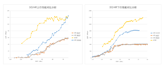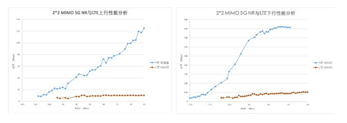 从下图 2 的测试结果可以看出,对比单路系统,双路系统升级到 5G 后的性能均有大幅度提升,相比 LTE 终端采用 1T2R,5G 上行边缘速率也有明显的提升。
