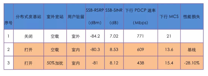 选择 4T4R 分布式皮基站部署的室内场景进行室内外同频干扰测试与分析,在室内覆盖设备开启且室外宏站空载的情况下,室内下行速率均值在 609Mbit/s,室外宏站 50%加扰的情况下,室内下行速率均值降至 438Mbit/s,平均容量损失在 28.1%,如表 1 所示。