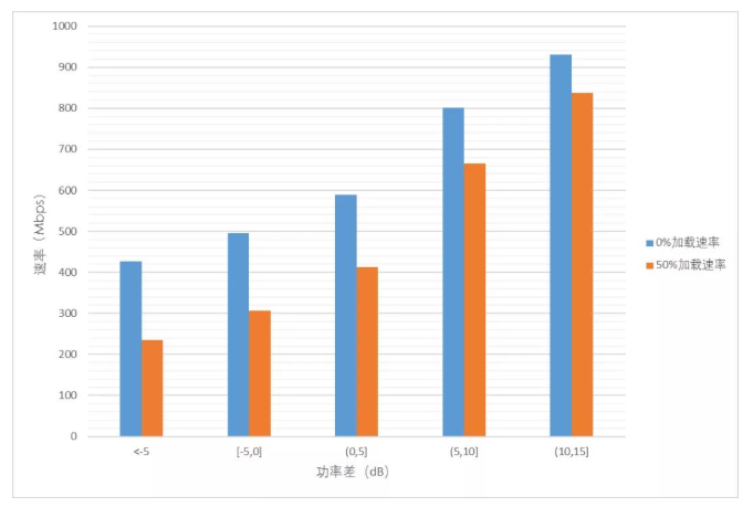 室内与室外不同电平差情况下,驻留室内用户的速率分布图如图 4 所示。根据统计分析,在室内与室外信号电平差在 -5dB 以上时,室外 50%加载情况下速率损失达到 44%,室内与室外信号电平差在 0~5dB 时,室内用户容量损失在 30%,室内与室外信号电平差在 5~10dB 时,室内用户性能损失可降低至 20%以下。室内外同频组网,室外对室内的性能产生较大影响,尤其是室外信号强度高于室内信号时,性能损失在 40%以上。为保证室内用户性能,室内覆盖网络的信号强度要满足室内电平高于室外电平 6dB,才能保证室内用户性能损失在 20%以内。