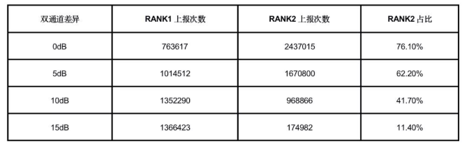对于 LTE 网络,采用 Rank2 占比对双通道的平衡性进行评估,如表 3 所示。当双通道差异为 0dB 时,Rank2 占比为 76%,双通道差异 5dB 时,Rank2 占比为 60%左右,当双通道差异进一步增大时,Rank2 的占比进一步降低,对网络性能产生较大影响,因此,可采用 Rank2 的占比对双通道平衡性进行评估。