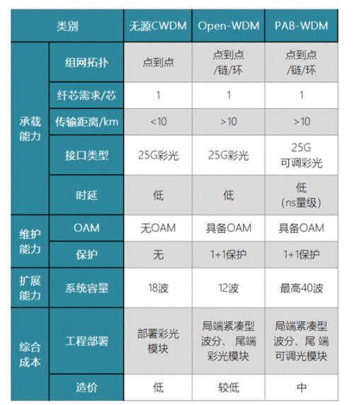 目前业内主流前传波分解决方案主要包括无源CWDM、半有源Open-WDM和PAB-WDM方案。