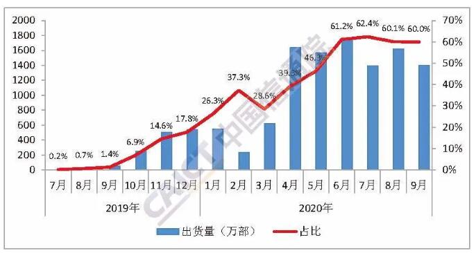 从5G手机的发展情况来看,今年9月,国内市场5G手机出货量1399万部,占同期手机出货量的60%,上市新机型26款,占同期手机上市新机型数量的44.8%。1-9月,国内市场5G手机累计出货量1.08亿部、上市新机型累计167款,占比分别为47.7%和46.5%。这一占比已连续4个月达到60%;此外,上市新机型26款,占同期手机上市新机型数量的44.8%。