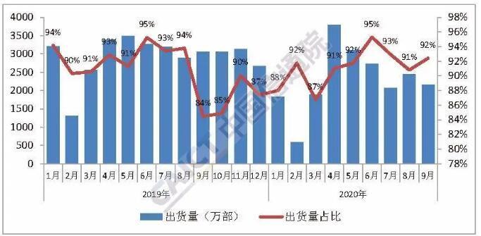 2020年9月,国产品牌手机出货量2156.3万部,同比下降29.6%,占同期手机出货量的92.4%;上市新机型51款,同比下降36.3%,占同期手机上市新机型数量的87.9%。1-9月,国产品牌手机出货量累计2.06亿部,同比下降22.0%,占同期手机出货量的91.3%;上市新机型累计327款,同比下降15.3%,占同期手机上市新机型数量的91.1%。