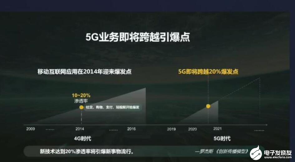 甘斌指出,5G业务即将跨越引爆点,根据4G时代的规律,在4G网络渗透率达到10-20%之后,移动互联网应用在2014年迎来爆发点。5G网络部署即将跨越20%爆发点。