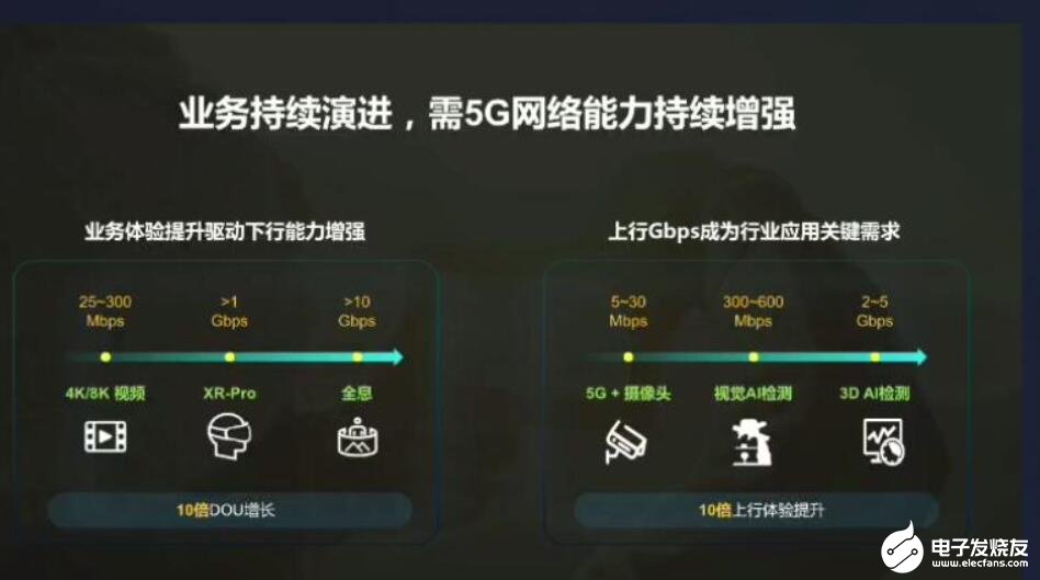 5G网络的上行能力不需要不断提升,煤矿使用的摄像头,然后做模式识别,来监督安全生产,需要70兆到300兆的视频监控能力,到了8K高清识别,需要更多AI检测,需要几百兆的上线能力。多维的视频检测和3D AI检测需要更多的带宽,上行的、单用户的需求增加10倍,容量需求增加10倍。