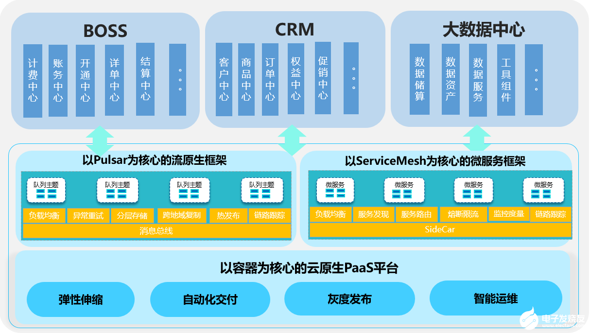 新一代业务支撑系统的建设核心包含三个方面:以Pulsar为核心的流原生技术框架、以ServiceMesh为核心的微服务框架、以容器为核心的云原生PaaS平台。