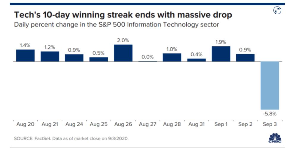 亚马逊和Netflix均下跌超过4%,Facebook下跌3.8%。微软下跌了6.2%。字母表回落5.1%。标普500科技板块收跌5.83%,跌幅为10天。该行业还创下了自三月份以来最大的单日亏损。