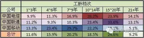 (表1-1三家运营商员工工龄情况表)