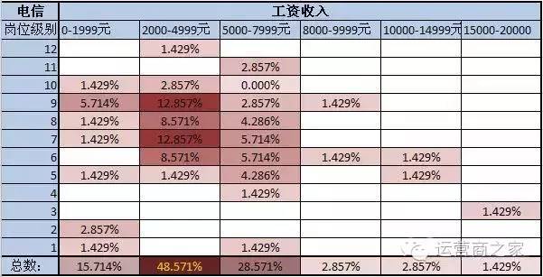 在薪酬情况调研方面,由于在初步分析中三家运营商整体数据基本一致,所以此后的统计将基本不分运营商进行分析(对于岗位层次,由于电信层级较少,且高低顺序与移动、联通不一致,故在此后的分析中会做一定的调整)。