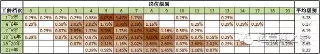 数据分布显示:在运营商基层,随着工龄增长,岗位基本呈增长态势。特别关注:工龄在“4~6年”和“7~9年”的基层员工,其平均岗位级别是“6.17”和“6.19”,几乎没有变化,且“1~3年”工龄的员工平均岗位与下一级的平均岗位也只相差“0.39”。以此看来,“1~9年”年龄层次的基层岗位员工很可能普遍存在升岗困难的情况,占总人数的比例较大,为27.9%。