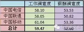 从总体来看,工作满意度(59.5)和薪酬满意度(52.6)都偏低,并有极其相似的数据分布,且薪酬满意度略低于工作满意度,可见:“基层员工整体性地认为工资偏低。”三家运营商的情况则基本一致。