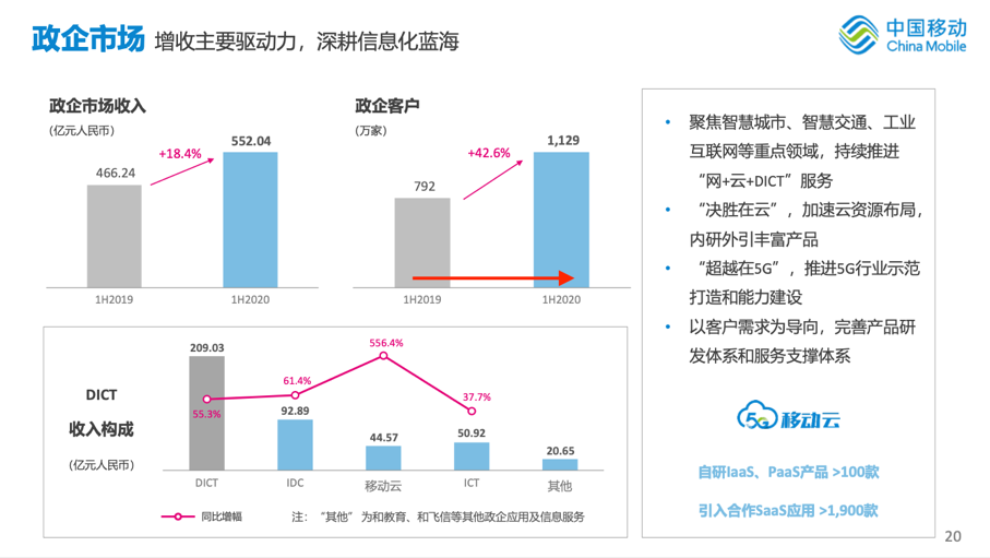 在政企市场方面,中国移动在业绩报告中称之为“蓝海”,是公司收入增长的主要引擎。上半年,中国移动政企客户数达到1,129 万家,较2019年底净增101万家;DICT收入达到人民币209亿元,同比增长55.3%。