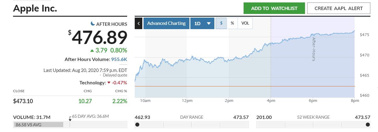 据外媒报道,8月19日上午,苹果公司市值一度突破2万亿美元,成为美国首家实现这一里程碑的上市公司。美国媒体表示,苹果股价今年上涨了57%以上。股价上涨至473.10美元。20日,股价继续上涨到476.89美元,与3月下旬谷值相比,苹果股价已经回升超过一倍。而形成鲜明对比的是,美国第二季国内生产总值年化后环比暴跌32.9%,创下自20世纪以来的最大跌幅。