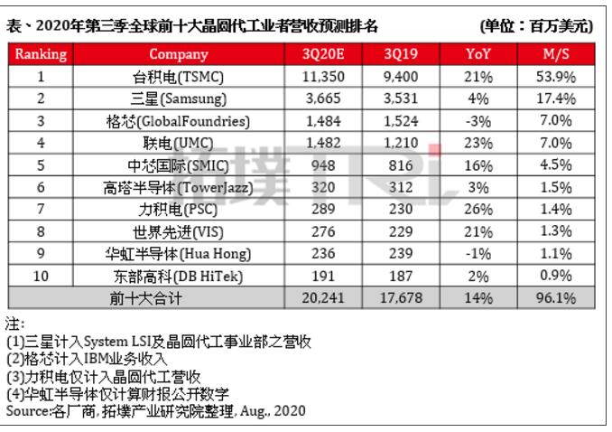 三星(Samsung)今年虽然受到旗舰手机S20系列销售下滑影响,使其调整自家AP的晶圆代工业务量;然客户为防止芯片断料的库存储备心态,带动其他晶圆代工业务成长,推估第三季营收年成长约4%。而格芯(GlobalFoundries)在2019年分别出售8寸、12寸晶圆厂,且受车用芯片需求衰退影响,其第三季营收表现不如预期,年减3%。
