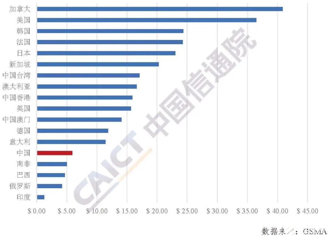 世界主要国家移动通信用户月均支出(单位:美元)