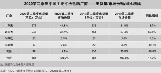 国际数据公司(IDC)最新发布的平板电脑季度跟踪报告显示:2020年第二季度中国平板电脑市场出货量约661万台,同比增长17.7%。