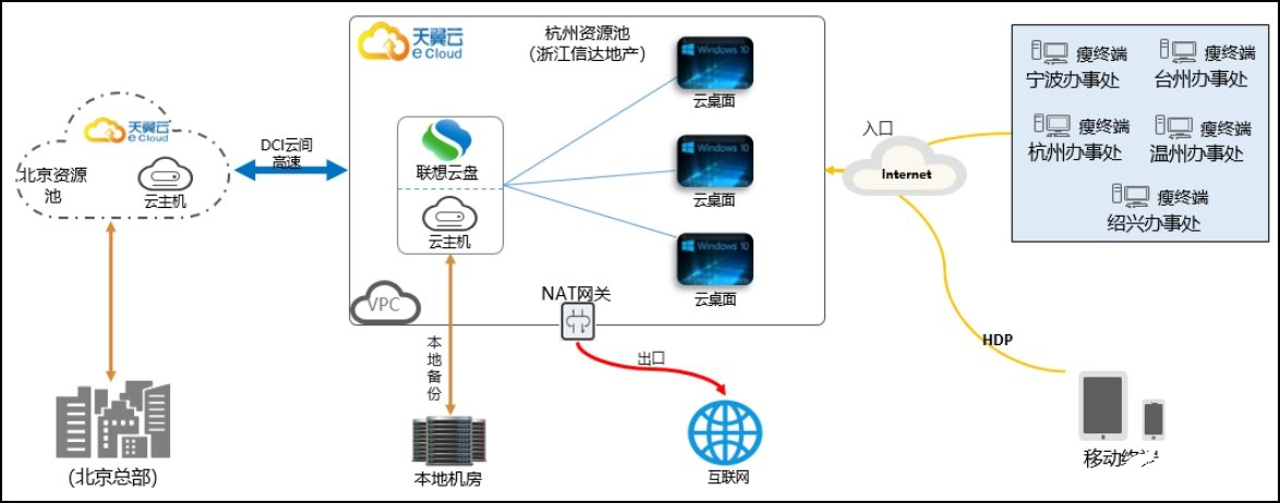 杭州资源池部署云桌面替换本地办公电脑,一台云主机部署联想企业云盘用以存储日常办公数据;云桌面通过云间高速到北京资源池主机,通过云主机访问到企业北京总部机房的业务系统(erp、oa等)。