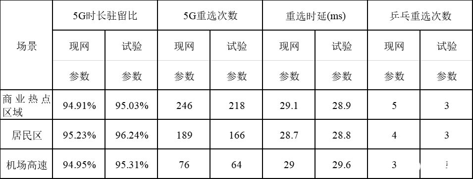 三个典型场景配置试验参数后,5G时长驻留比有所提升,乒乓重选几率降低。