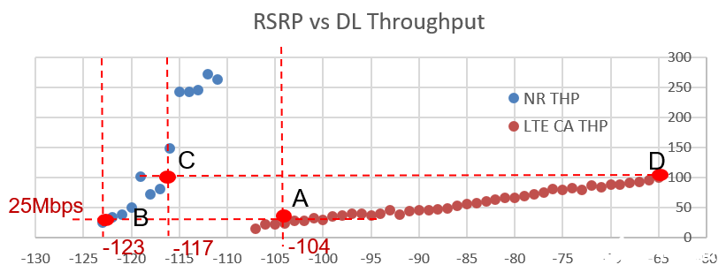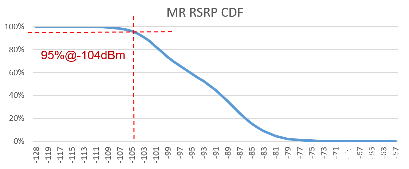 4G/5G互操作设计原则:5G体验优于4G,则优先驻留在5G;极边缘用户才转移到4G,此时满足4G体验优于5G;在4G始终尝试转移5G,只要5G体验优于4G,则实施迁移。根据4G MR采样数据及5G实际测试数据,分析4G/5G互操作参数门限设计的合理性。由图3可知,LTE在95%覆盖区域RSRP大于-104dBm,作为5G异系统B1门限,此时D频段的下行拉网速率为25Mbit/s,5G该速率时对应的RSRP为-123dBm,作为5G侧的4G异系统A2起测门限,A1停止测量门限建议设置成-117dBm(此时NR下行吞吐率始终好于LTE)。