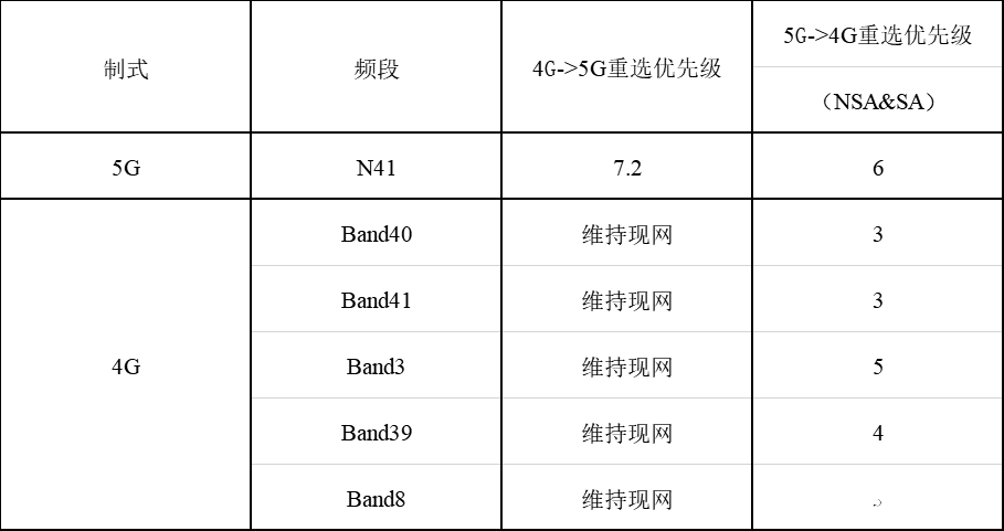 注:重选优先级表示服务频点的小区重选绝对优先级,0表示最低优先级,7表示最高优先级,NR的服务频点优先级可以在优先级7基础上增加小数,以实现NR频点的优先驻留。