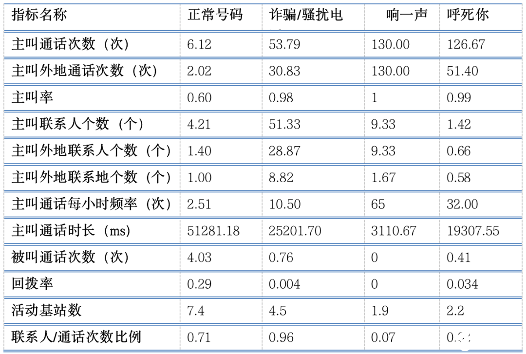 (1)诈骗/骚扰电话、响一声、呼死你在主叫通话次数、主叫率、主叫通话频率都大大高于正常号码,而在回拨率上大大低于正常号码。