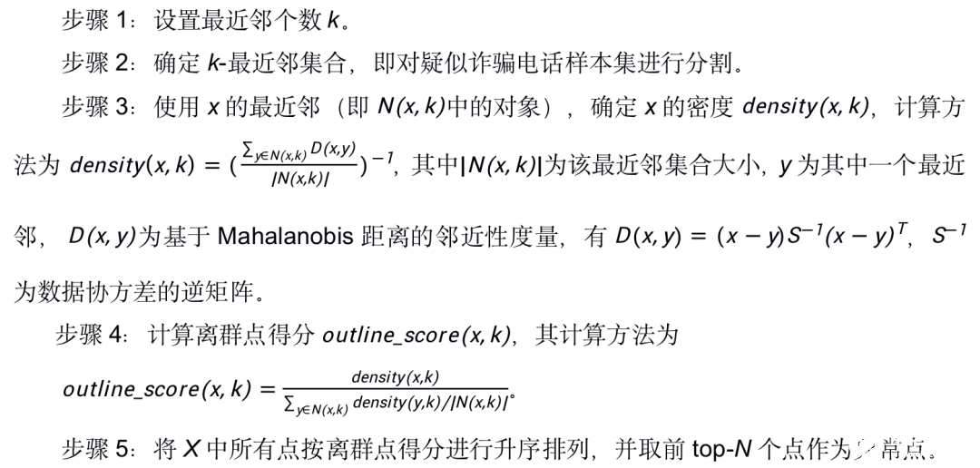 由于对于疑似诈骗电话样本,难以获得其是否为真正诈骗的标签,因此采用无监督学习方法中的离群点检测技术,找到疑似诈骗电话中的异常点,作为诈骗电话。将疑似诈骗电话样本集视为X,通过引入基于相对密度概念技术,将离群的得分较高前N个号码视为诈骗电话,诈骗电话识别规则的具体算法步骤如下。