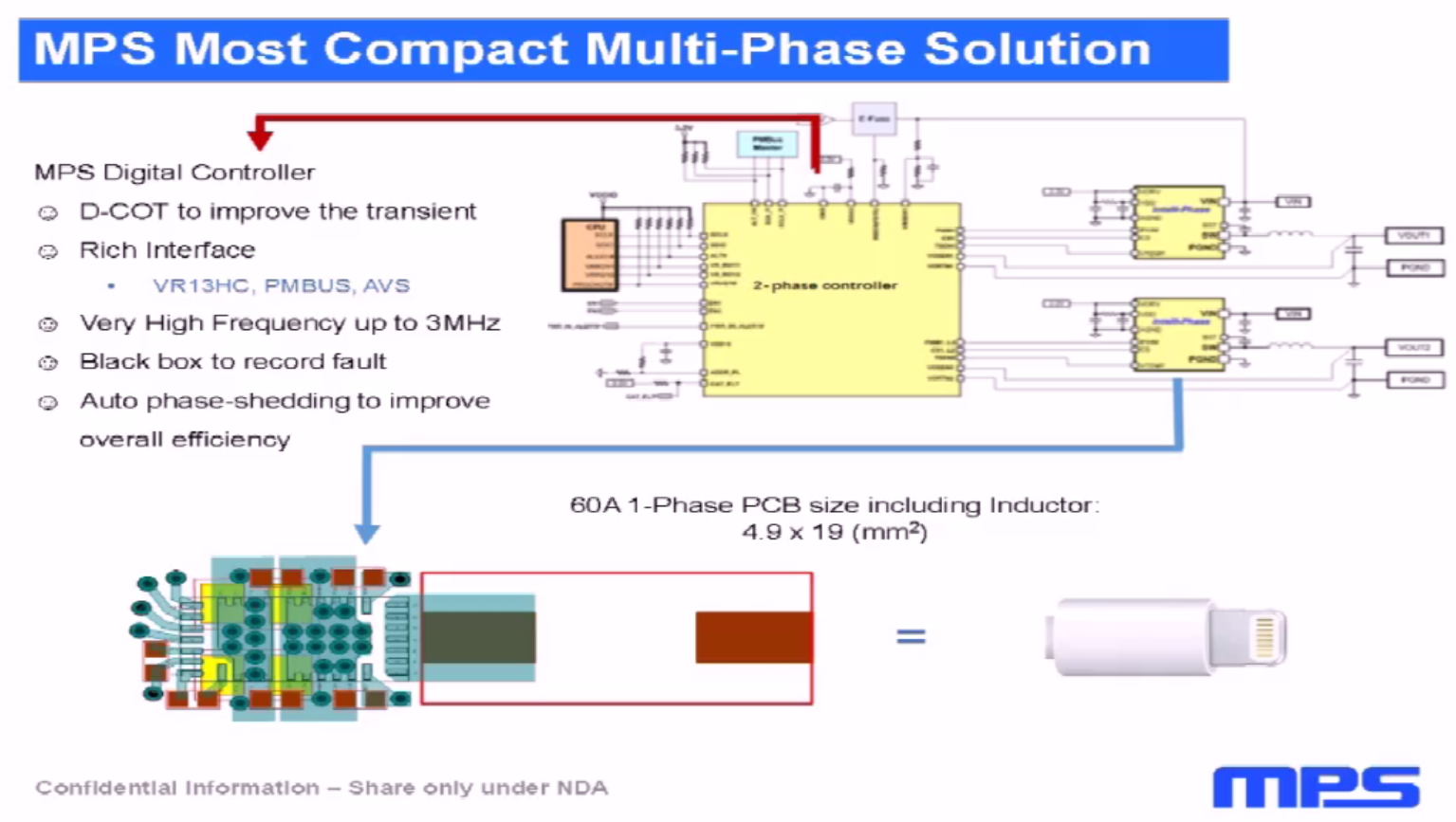在三次电源,也就是板级电源方面,MPS的卢平做了进一步的解释。在4G时代,大电流的设计通常来说做得比较简单,单通道的DCDC基本就满足需求了。到5G时代,电流变大了之后,更多会采用多相电源的设计,原因是,多相电源设计将控制器和功率级分开之后,可以比传统的DCDC更有效率,体积上也更有优势,而且灵活性也会更强。