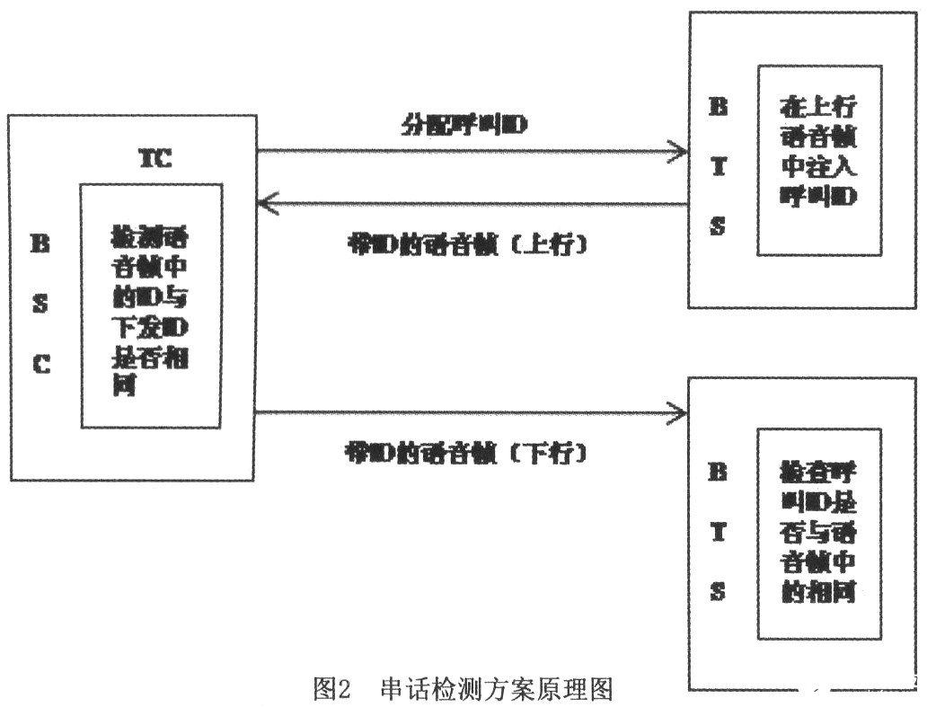 在每一次通话建链时,TC都会给基站下发一个长度为两个字节的Call ID,ID的内容在每一次通话时都会不同。基站收到这个Call ID后,会将ID写到语音帧中去,作为该次通话的标识。当语音数据从基站传到BSC的TC(码转化器)部分时,TC就会取出语音帧中的Call ID,并将这个Call ID与自己保存的Call ID相比较,如果ID号一致,就认为语音链路正确;如果ID号不一致,就说明有两条语音链路出现了串话,BSC会记录串话日志。当语音帧在下行传到另一基站侧时,基站中的DSP模块同样地会对语音帧中的Call ID做一次校验,用同样的方法判断下行链路是否出现串话。原理图如图2所示: