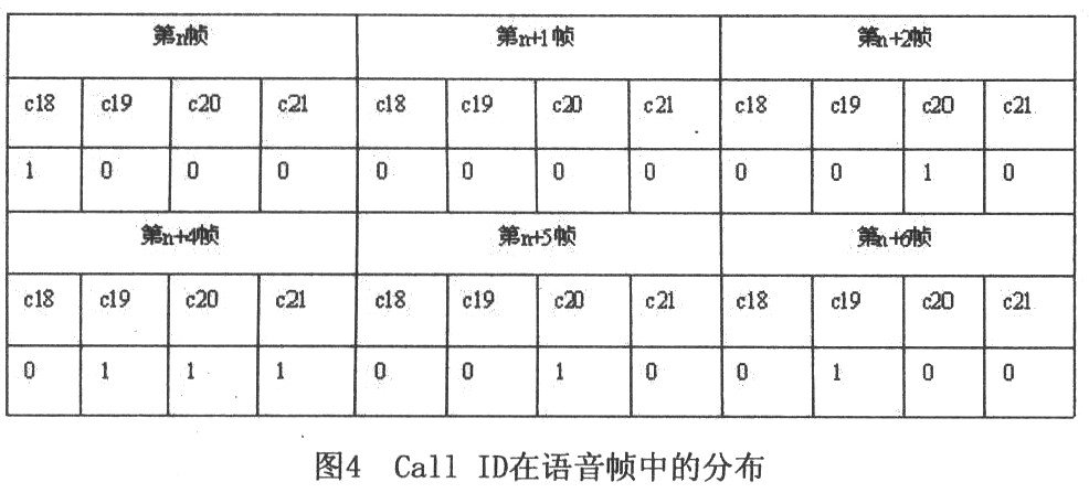 为了不影响通话质量,Call ID会写在语音帧中没被利用的地方。由GSM协议中对TRAU帧的结构定义可以看出,C18-c21比特位是空闲的。因此,可将Call ID填写在此处。如图3所示:
