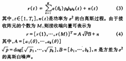 一个具有K个用户的DS-CDMA系统,接收端为具有M个阵元的均匀直线阵。假定第k个用户的功率为pk,DOA为θk,阵列响应矩阵为