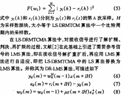 CDMA系统中,用户的PN码是已知的。在接收端,由用户i的PN码产生的扩频信号记为ci(t),把ci(t)延迟τi后与接收信号进行相关处理,处理后再进行判决,记第n个信息比特判决结果为bin,如果判决正确,即有bin=bin,把ci(t)延时后τi再对bin进行扩频,就可以得到用户i解扩重扩后的信号ripn,它和输入信号yi(t)的硬限幅信号rcim进行加权求和来构造用户i在时间[(n一1)Tb,nTb]的发射波形ri(t),这就是LS-DRMTCM算法,其代价函数可表示为: