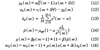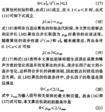 算法中,μ(m)为算法的迭代步长,控制算法的收敛速度,由步长调整原则可知,在算法迭代的初始阶段,步长应较大,以便得到较大的收敛速度,而在收敛阶段,不管测量噪声多大,都应以较小的步长,以达到较低的稳态失调。eil(m)为生成的误差信号;μopt为定步长时算法收敛最快时的步长;α为调整因子,其取值范围定为0.1《α《R,R为算法收敛后稳态均方误差与噪声方差之比;β为平滑因子,取值范围为O《β《l;σ2N为测量噪声N(n)的方差。