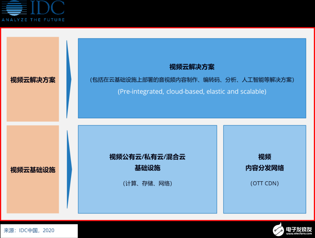根据IDC定义,本次视频云研究覆盖了面向视频应用场景的全部公有云、私有云和混合云基础设施;视频内容分发网络(CDN);以及在视频云基础设施上部署的云平台、应用解决方案。应用场景主要包括直播点播、媒体处理、智能内容、音视频监控等。