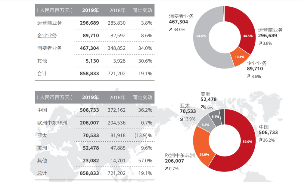 以2019年为例,华为全年销售收入为人民币8588亿元,同比增长19.1%。在这一年,消费者业务占总营收比例首次超50%,而2018年以前,运营商业务才是华为收入占比最高的业务。