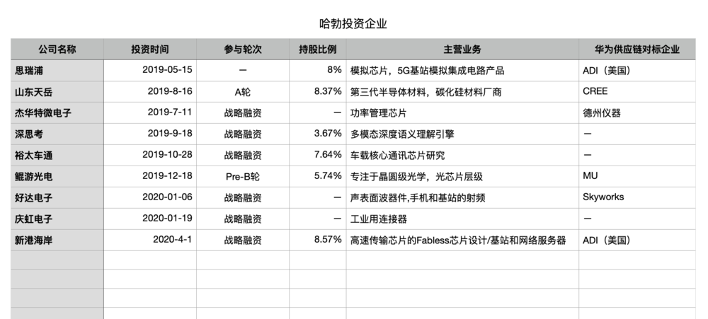 以下为哈勃投资的投资标的: