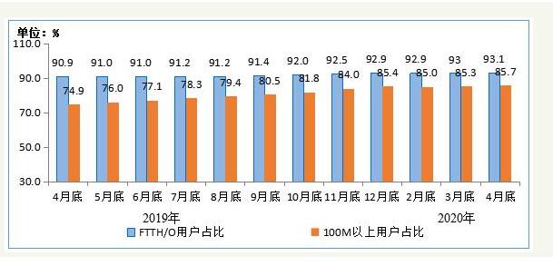 在固定宽带接入用户规模稳步增长的同时,百兆光纤接入用户占比逐步提升。截至4月末,三家运营商的的宽带用户总数达4.59亿户,其中100Mbps及以上接入速率的宽带接入用户达3.93亿户,占总用户数的85.7%,较3月末提高0.4个百分点。