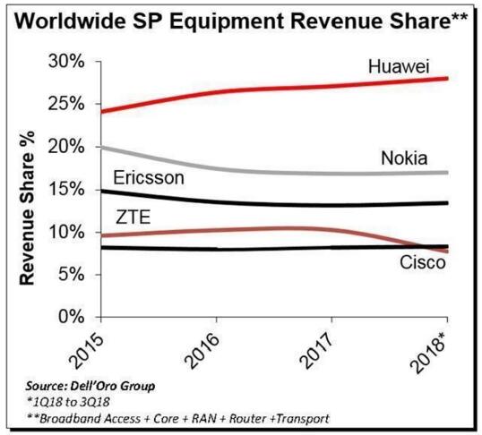 近年来,华为已超越上述两家北欧企业,成为全球最大的电信设备制造商。市场研究公司Dell ‘Oro Group的数据显示,在2018年前三个季度,华为在全球电信设备市场的份额为28%,诺基亚为17%,爱立信为13.4%。相比之下,华为、诺基亚和爱立信在2017年的市场份额分别为27.1%、16.8%和13.2%。